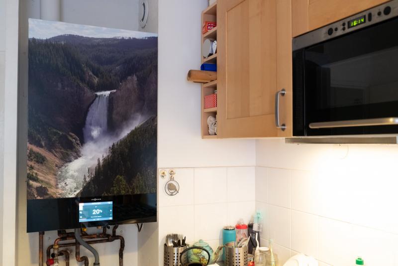 " La chaudière marche bien, son interface est très ergonomique (sur un bel écran tactile 7"). l'application vicare est bien aussi. du coup, on se demande à quoi sert le vitotrol, un boitier plus simple pour mesurer la température suffirait (l'écran fait doublon avec ceux de la chaudière et de vicare). niveau design, la chaudière est sobre, ça passe partout. mais il est dommage de ne pas proposer des capots avec des décors, cela serait une option intéressante quand la chaudière est visible. j'ai contourné ça en mettant une photo imprimée sur du film adhésif (une chute d'eau du canyon de yellowstone qui me semblait appropriée avec son eau bouillonnante)."