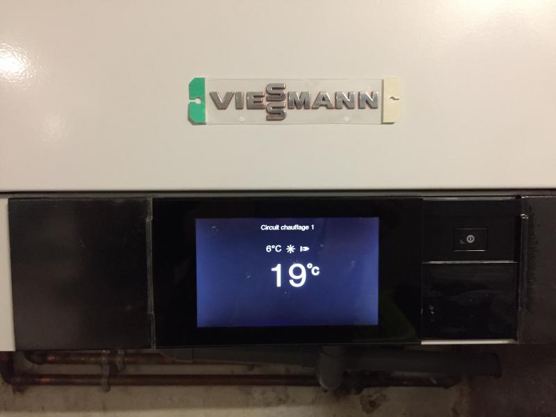 " Super chaudière avec régulation intuitive couleur, la vitodens 222-f avec eau chaude est très compacte elle ressemble à un frigo. très satisfait."
